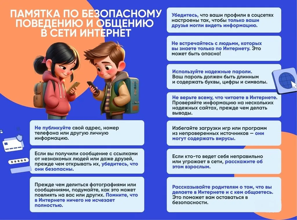 - 🔒 Не разглашай личные данные. Не указывай адрес, школу, номер телефона и другую личную информацию. Это защищает от мошенников и недоброжелателей.